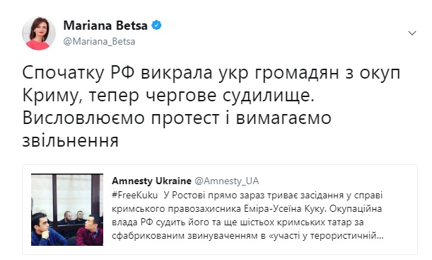 «Сначала РФ похитила украинских граждан из оккупированного Крыма, теперь очередное судилище. Выражаем протест и требуем освобождения», — написала Марьяна Беца.