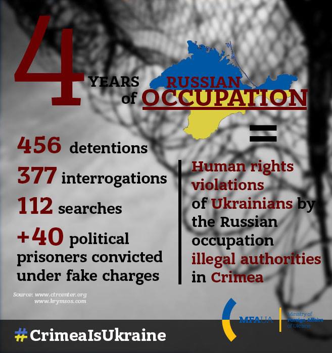 «После четырех лет оккупации ситуация с правами человека в Крыму сильно ухудшилась. Задержания украинцев и крымских татар стали обычной практикой. Россия продолжает жить в своем имперском прошлом, затягивая Украину обратно в СССР. Мы не будем играть по российскому сценарию», — отметили в МИД.