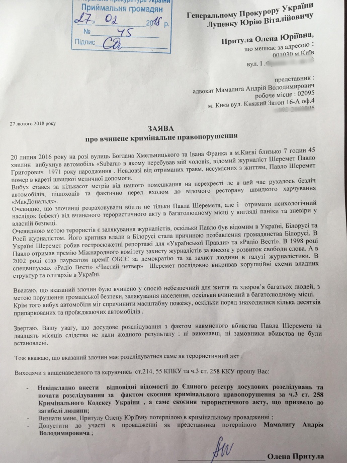 По мнению редактора-основателя «Украинской правды» Алены Притулы убийство журналиста УП Павла Шеремета в 2016 году должно расследоваться как теракт.