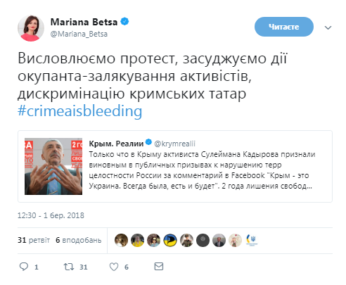 «Выражаем протест, осуждаем действия оккупанта — запугивание активистов, дискриминацию крымских татар», — написала она.
