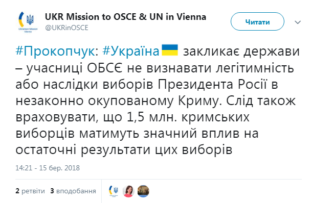 Украинская миссия в ОБСЕ призывает страны, которые являются участницами Организации по безопасности и сотрудничеству в Европе не признавать легитимность выборов президента РФ в оккупированном Крыму.