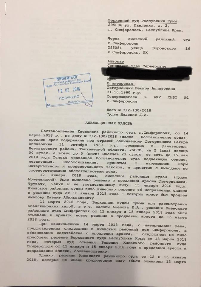 В понедельник, 19 марта, адвокат фигуранта «дела Веджие Кашка» Бекира Дегерменджи Эдем Семедляев подал апелляционную жалобу на решение «суда» о продлении ареста крымскому татарину.