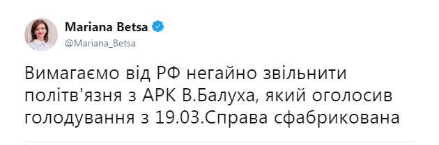 «Требуем от России немедленно освободить политзаключенного из АРК Владимира Балуха, который объявил голодовку с 19 марта. Дело сфабриковано», — написала Беца.