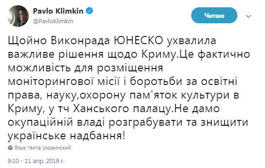 «Исполнительный совет ЮНЕСКО принял важное решение по Крыму. Это фактически возможность для размещения мониторинговой миссии и борьбы за образовательные права, науку, охрану памятников культуры в Крыму, в том числе и Ханского дворца. Не дадим оккупационной власти грабить и уничтожать украинское достояние!» — написал Климкин.