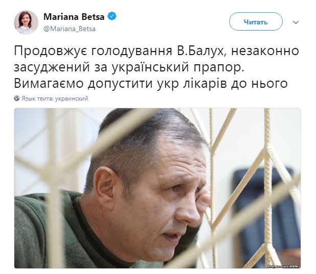 «Продолжает голодовку Владимир Балух, незаконно осужденный за украинский флаг. Требуем допустить украинских врачей к нему», — написала она.
