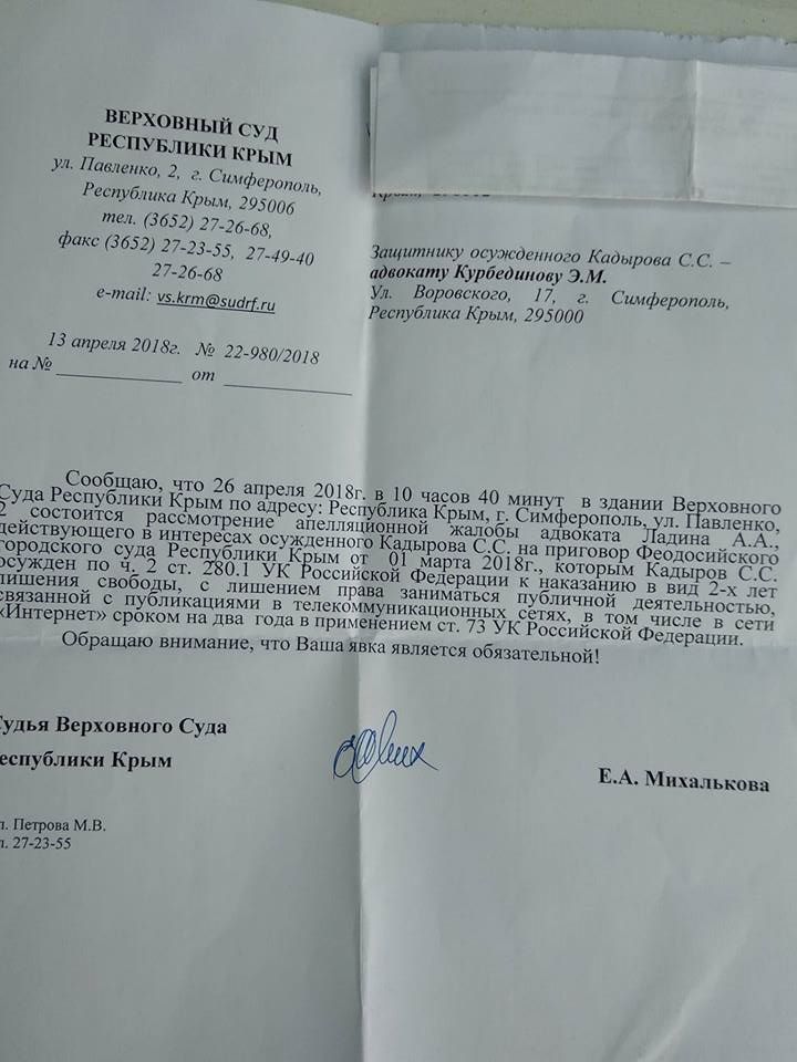 «Суд» рассмотрит апелляционную жалобу защиты Сулеймана Кадырова на приговор «Феодосийского городского суда» от 1 марта 2018 года.