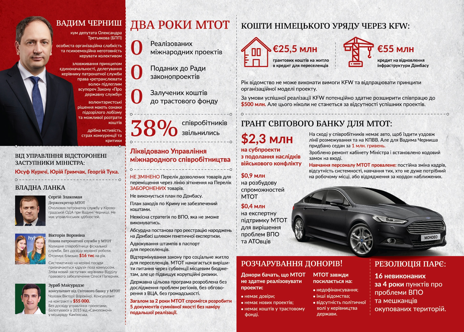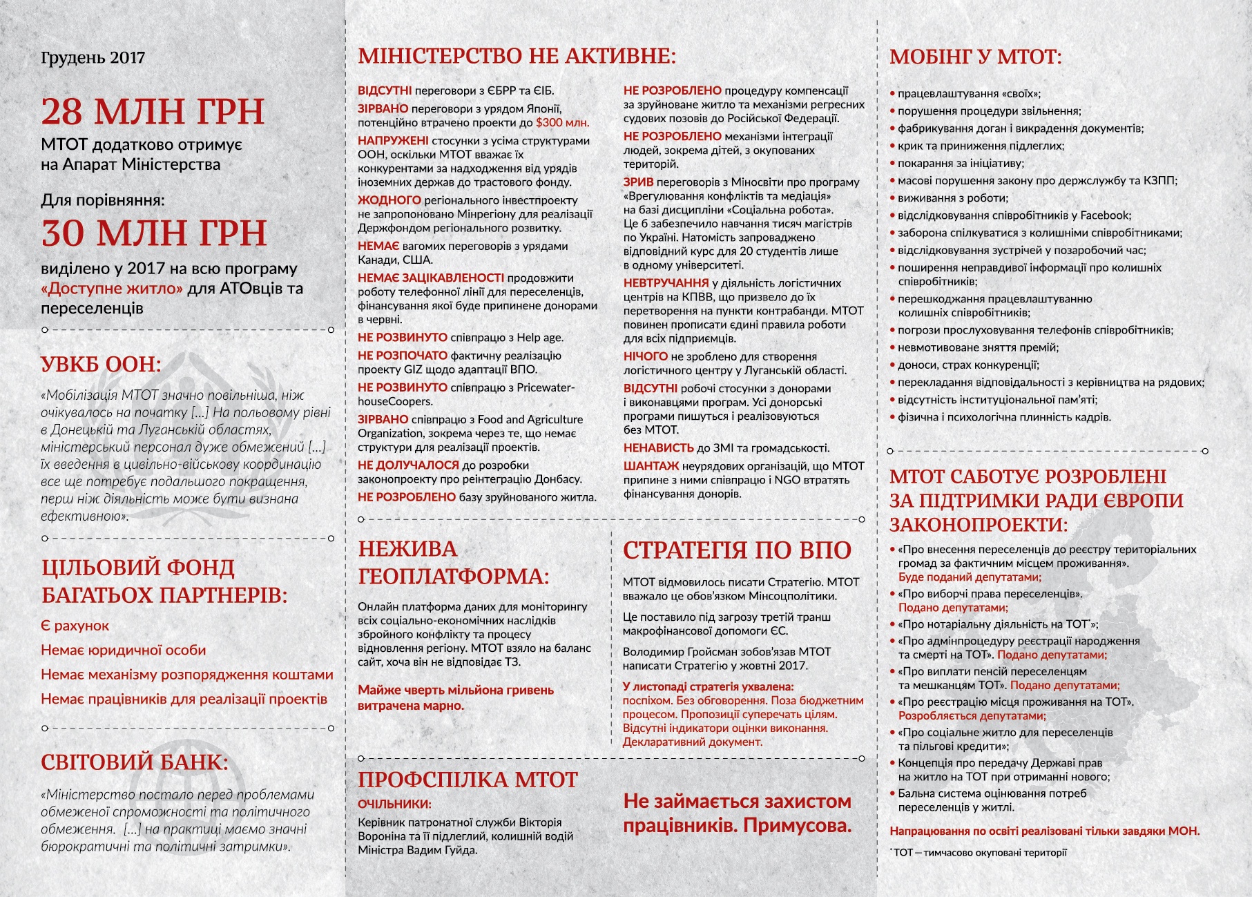 В инфографике также сказано, что МинВот имеет напряженные отношения со всеми структурами ООН, а также не принимало участия в разработке законопроекта о реинтеграции Донбасса.