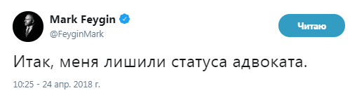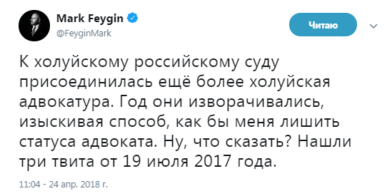 «К холуйскому российскому суду присоединилась ещё более холуйская адвокатура. Год они изворачивались, изыскивая способ, как бы меня лишить статуса адвоката. Ну, что сказать? Нашли три твита от 19 июля 2017 года», — прокомментировал Фейгин.