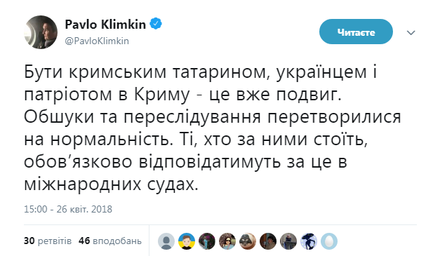 «Быть крымским татарином, украинцем и патриотом в Крыму — это уже подвиг. Обыски и преследования превратились в нормальность. Те, кто за ними стоит, обязательно будут отвечать за это в международных судах», — написал глава украинского внешнеполитического ведомства.