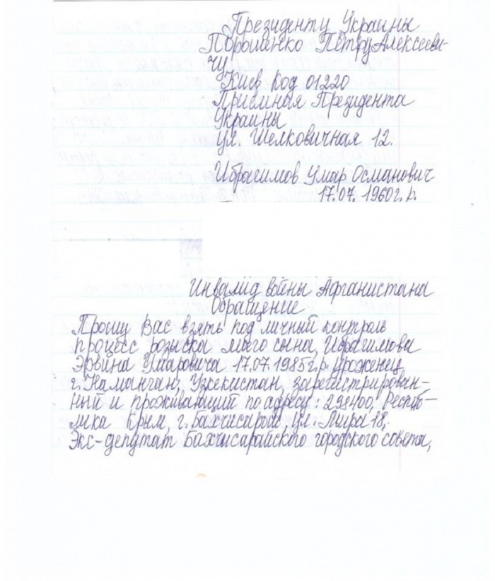 Копию письма родителей Эрвина, Умера Ибрагимова и Лили Алиевой, опубликовала общественная организация «Крым-SOS». Отметим, это уже второе письмо к Порошенко от имени родителей Эрвина Ибрагимова с просьбой помочь найти виновных в преступлении против их сына.