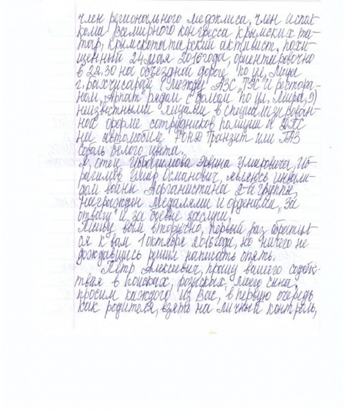 «Пане Президенте! С чувством сильной тревоги обращаюсь к Вам за судьбу сына и других похищенных и надеюсь, что будут приложены дополнительные усилия по их поиску и освобождению. Мы, родители похищенных крымских татар, уверенны, что их вина − в безмерной любви к Украине, что они являются ее настоящими патриотами.