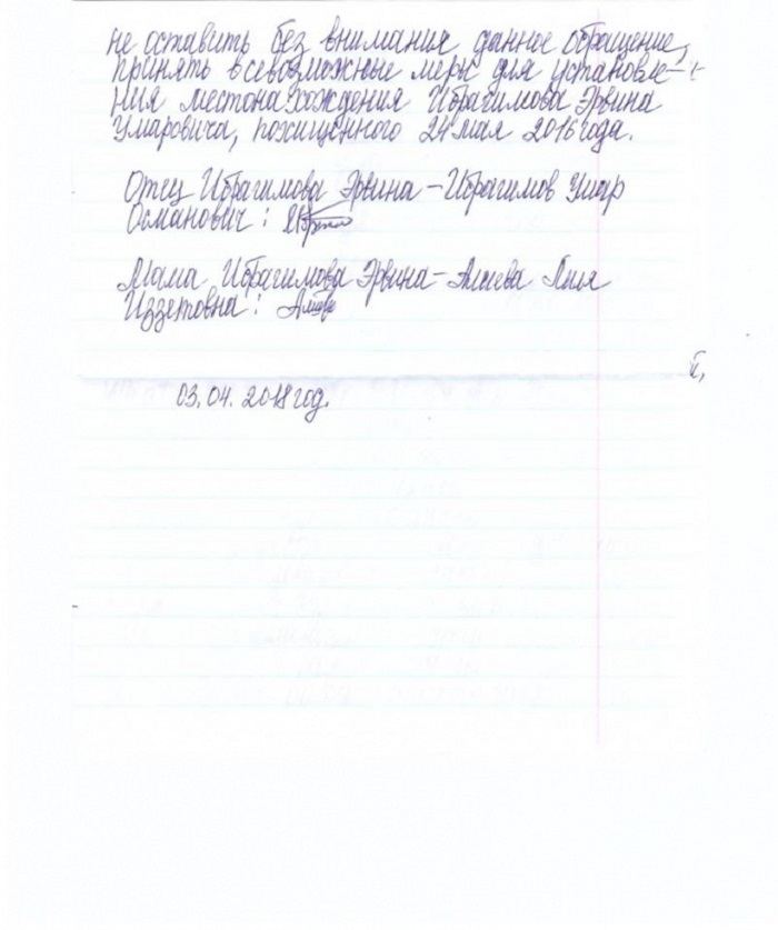 «Пишу вам вторично. Первый раз обратился к вам 1 октября 2016 года, но ничего не дождавшись, решил написать опять. Петр Алексеевич, прошу вашего содействия в поисках, розысках моего сына. Просим каждого из Вас, в первую очередь, как родителя, взять на личный контроль, не оставить без внимания это обращение, принять всевозможные меры для установления местонахождения Ибрагимова Эрвина Умаровича, похищенного 24 мая 2016 года», — написал Умер Ибрагимов.