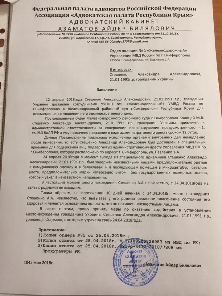 Адвокат Айдер Азаматов направил в «полицию» заявление о похищении в оккупированном Крыму харьковчанина Александра Стешенко.