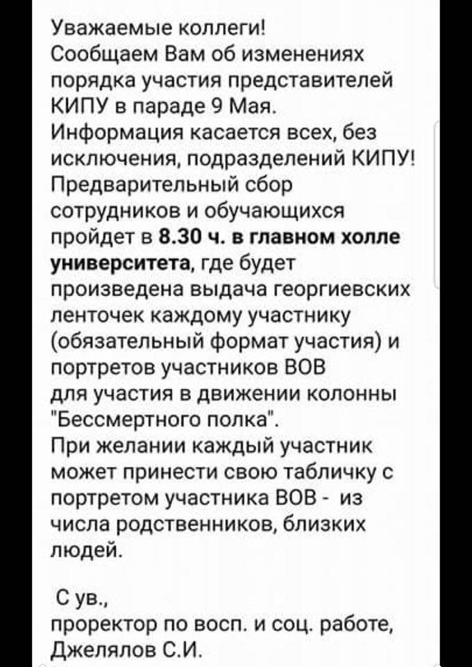 Работники Крымского инженерно-педагогического университета (КИПУ) в Симферополе накануне 9 мая получили от проректора по воспитательной и социальной работе Сервера Джелялова сообщение, в котором говорится об обязательном участии коллектива и студентов университета в параде 9 мая.