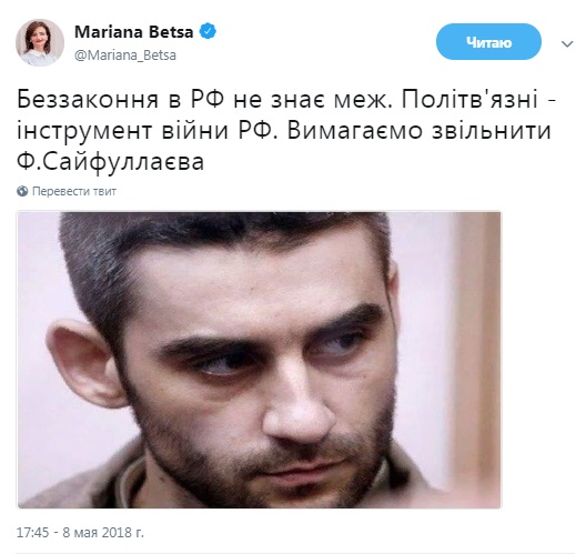 «Беззаконие в РФ не знает границ. Политзаключенные — инструмент войны РФ. Требуем освободить Сайфуллаева», — написала в Twitter спикер МИД Украины Марьяна Беца.