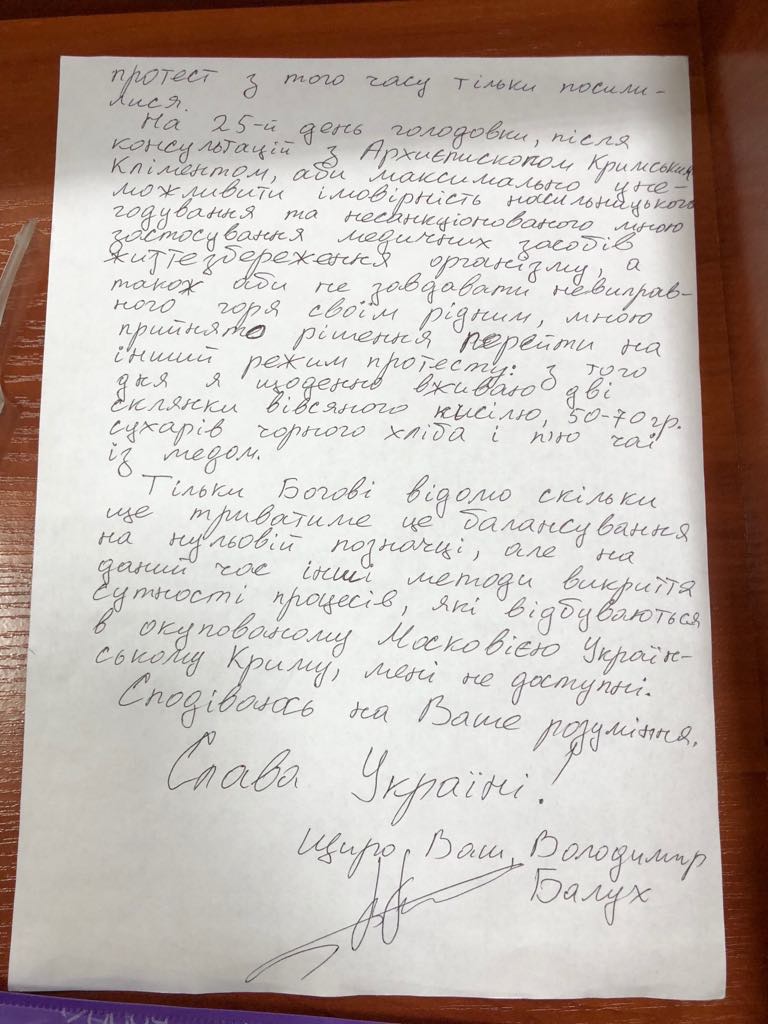 Жодного разу, за весь час перебування в полоні, я не вживав тюремної «баланди» і добровільно не зроблю цього за жодних обставин. 14 березня цього року, коли черговий наскрізь брехливий вирок у сфабрикованій проти мене справі набув «чинності», я прийняв рішення оголосити протестне голодування, як вияв свого особистого презирства до окупаційного режиму і їхніх жалких потуг будь-що позбавити свободи всіх незгодних з їх ординсько-феесбешною «ідеологією» людиноненависті.