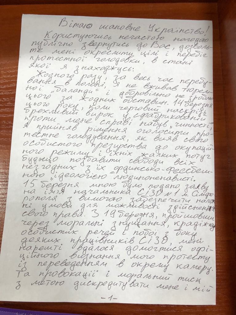 В нем он рассказал о причинах протестной голодовки, а также о моральном и физическом насилии в СИЗО №1 Симферополя, где он сейчас находится.