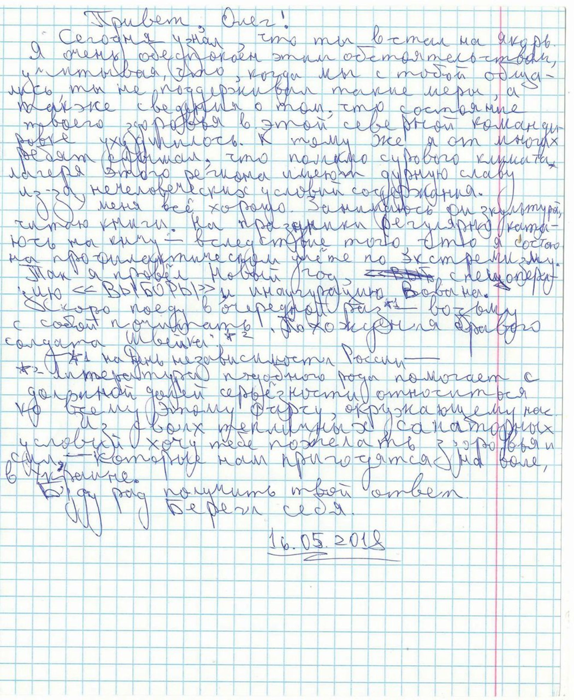 «Привет, Олег. Сегодня узнал что ты встал на якорь (объявил голодовку — «15 минут»). Я очень обеспокоен этим обстоятельством, учитывая, что когда мы с тобой общались, ты не поддерживал такие меры, а также сведения о том, что состояние твоего здоровья в этой северной командировке ухудшилось. К тому же я от многих ребят слышал, что, помимо сурового климата, лагеря этого региона имеют дурную славу из-за нечеловеческих условий содержания», — пишет Кольченко.