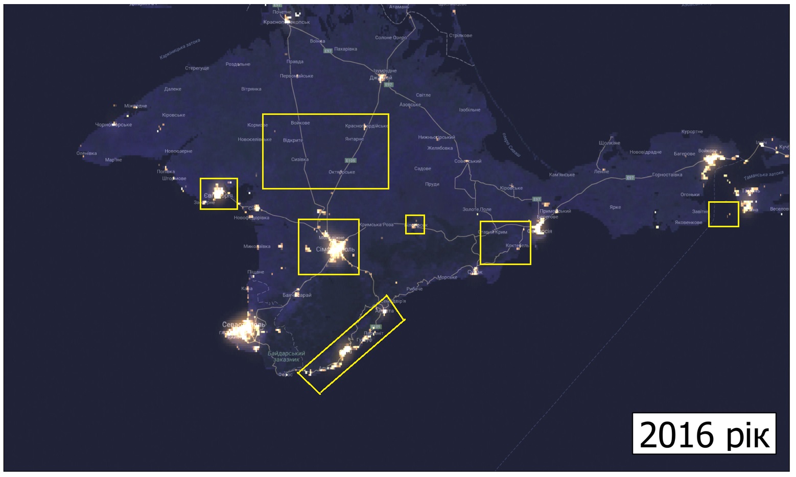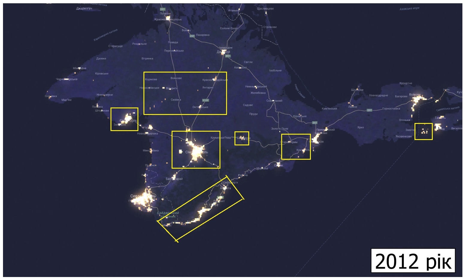 Наименьшее снижение уровня освещенности наблюдается в населенных пунктах, в которых расположены объекты Черноморского флота и ВС России (Севастополь, Феодосия, Джанкой, Новофедоровка) и в районе строительства Керченского моста (остров Тузла).