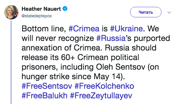 «Крым — это Украина. Мы никогда не признаем российские попытки аннексировать Крым. Россия должна освободить более 60 крымских политзаключенных, включая Олегом Сенцов (который с 14 мая голодает в знак протеста)», — написала Нойерт.