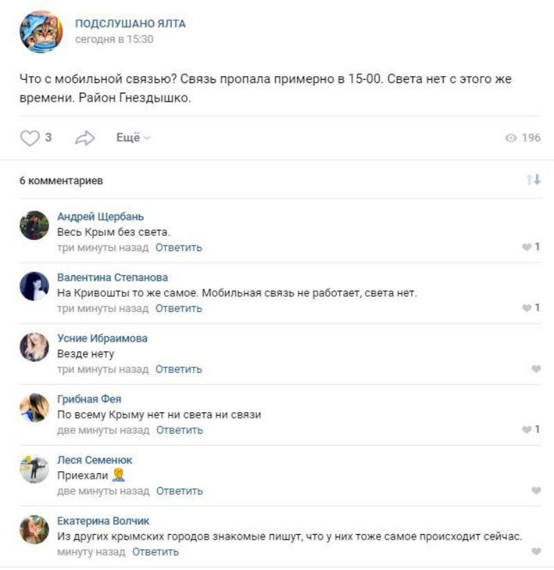 Об отключении электричества сообщили жители Симферополя, Севастополя, Ялты и Алушты. Во всех перечисленных городах, а также в Керчи и Феодосии наблюдаются проблемы с сотовой связью. По данным «Крым.Реалии», в Севастополе не работает мобильный оператор МТС, однако продолжают работать телефонные операторы «Севтелеком» и «Севмобайл».