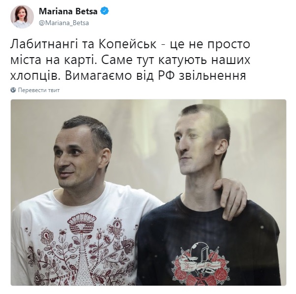 «Лабытнанги и Копейск — это не просто города на карте. Именно здесь мучают наших ребят. Требуем от РФ освобождения (Сенцова и Кольченко — «15 минут»)», — написала Марьяна Беца.