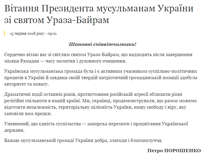 Президент Украины Петр Порошенко поздравил мусульман Украины с праздником Ураза-Байрам.