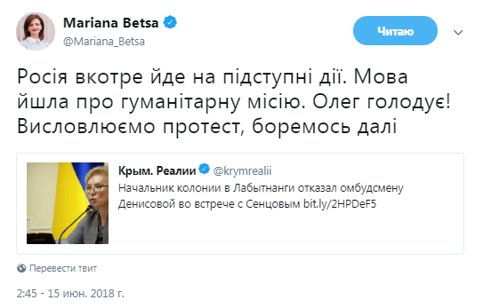 «Россия в который раз идет на подлые действия. Речь шла о гуманитарной мисси. Олег голодает! Выражаем протест, боремся дальше», — написала в Twitter Марьяна Беца.