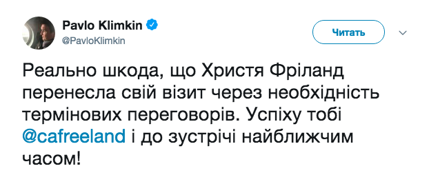 «Реально жаль, что Фриланд перенесла свой визит из-за необходимости срочных переговоров. Удачи и до встречи в ближайшее время», — написал он в Twitter.