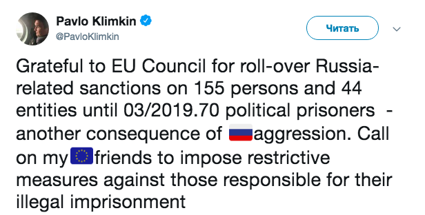 «Благодарен Совету ЕС за продление санкций в отношении России против 155 человек и 44 компаний до марта 2019 года. 70 политзаключенных — еще одно последствие российской агрессии. Призываю европейских друзей ввести ограничительные меры в отношении лиц, ответственных за их незаконное лишение свободы», — заявил Павел Климкин.