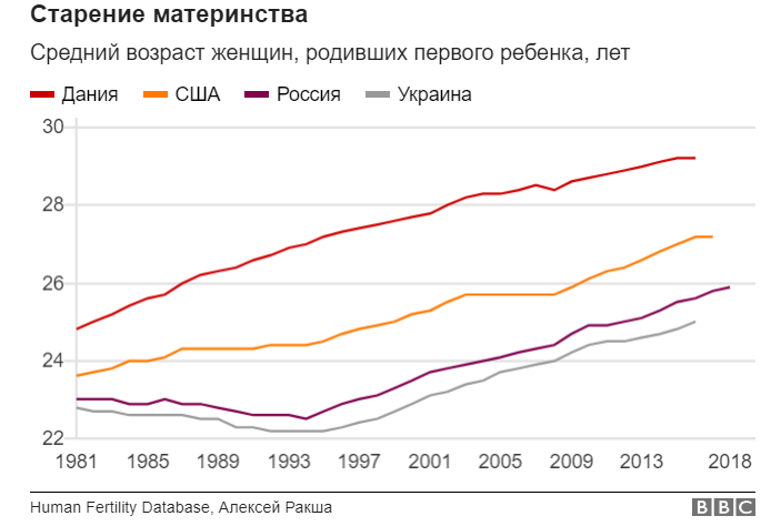 Российские демографы сообщили, что средний возраст рождения первого ребенка в РФ растет с 1995 года и по итогам 2018 года достигнет 25,9 лет.