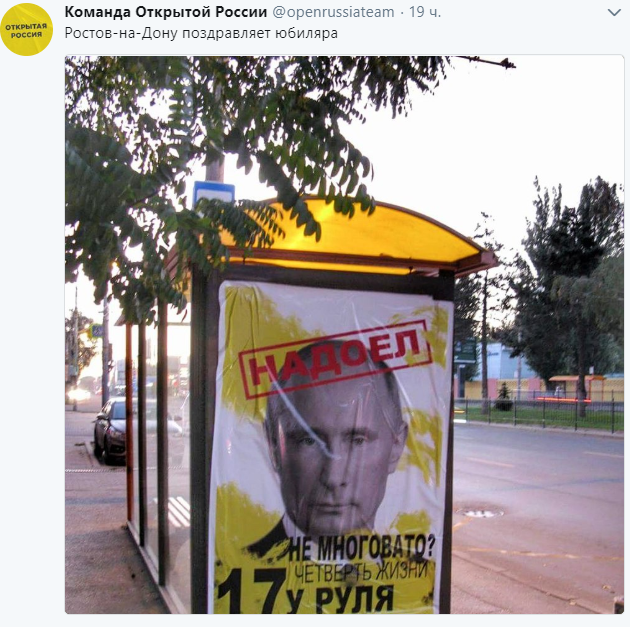 Кроме этого, Владимира Путина поздравили и в Ростове-на-Дону. Там по городу появились баннеры с надписью: «Надоел. Не многовато? Четверть жизни, 17 лет у руля».