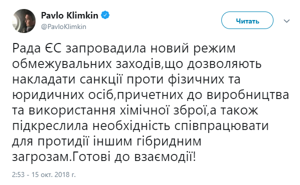 «Совет ЕС ввел новый режим ограничительных мероприятий, которые позволяют накладывать санкции против физических и юридических лиц, причастных к производству и использованию химического оружия, а также подчеркнул необходимость сотрудничать для противодействия другим гибридным угрозам. Готовы к взаимодействию!», — написал глава МИД Украины.