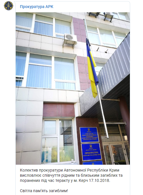 «Коллектив прокуратуры Автономной Республики Крым выражает соболезнования родным и близким погибших и раненых при теракте в городе Керчь 17.10.2018. Светлая память погибшим!», — говорится в сообщении.