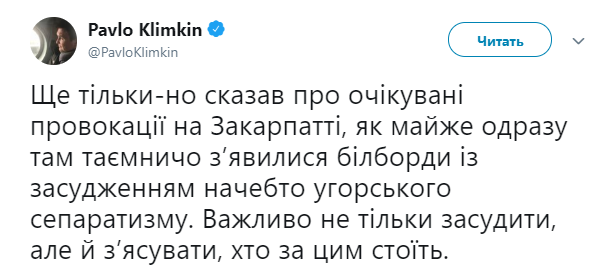 «Еще только вот сказал об ожидаемых провокациях в Закарпатье, как почти сразу там таинственно появились билборды с осуждением якобы венгерского сепаратизма. Важно не только осудить, но и выяснить, кто за этим стоит», — написал глава МИД Украины Павел Климкин в своем Twitter.