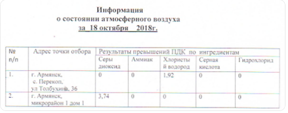 Он также опубликовал официальные данные о состоянии атмосферного воздуха на 18 октября 2018 года, где указано, что предельно допустимые нормы по диоксиду серы превышены в 3,74 раза, хлористому водороду — в 1,92 раза.