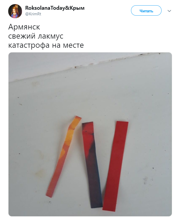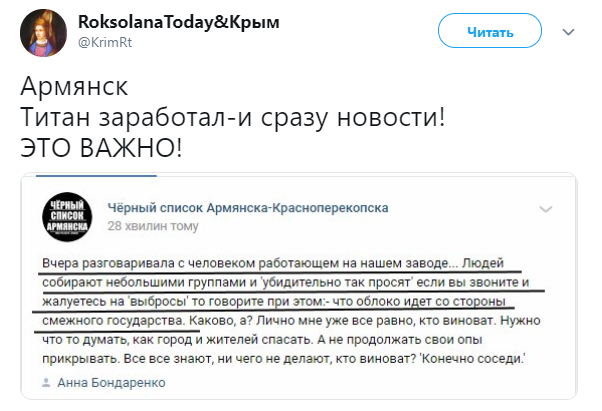 Как известно, 23 августа жители северной части Крыма начали жаловаться на тошноту и головные боли, в некоторых местах за ночь металлические предметы покрылись ржавчиной, на деревьях пожелтели и опали листья. В Армянске и десятке близлежащих селах началась эвакуация. 30 августа «власти» Крыма заявили, что, согласно предварительным данным экспертизы, вредные вещества на севере Крыма — это испарения содержимого кислотонакопителя, используемого заводом «Крымский титан». В сентябре оккупанты приняли решение временно прекратить работу завода.