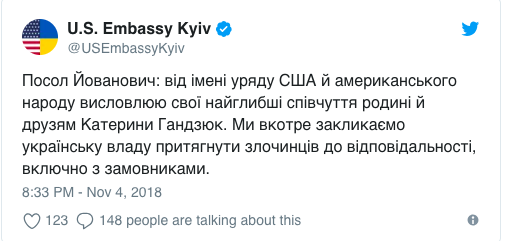 «От имени правительства США и американского народа выражаем свои глубочайшие соболезнования семье и друзьям Екатерины Гандзюк. Мы в очередной раз призываем украинскую власть привлечь преступников к ответственности, включая с заказчиками», — заявила Йованович.