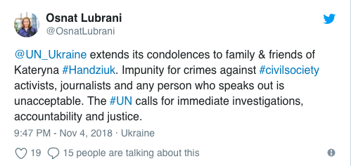 «Безнаказанность преступлений против общественных активистов, журналистов и других лиц, выступающих публично, неприемлема. ООН призывает к немедленному расследованию, подотчетности и справедливости», — заявила представитель ООН в Украине Оснат Лубрани.