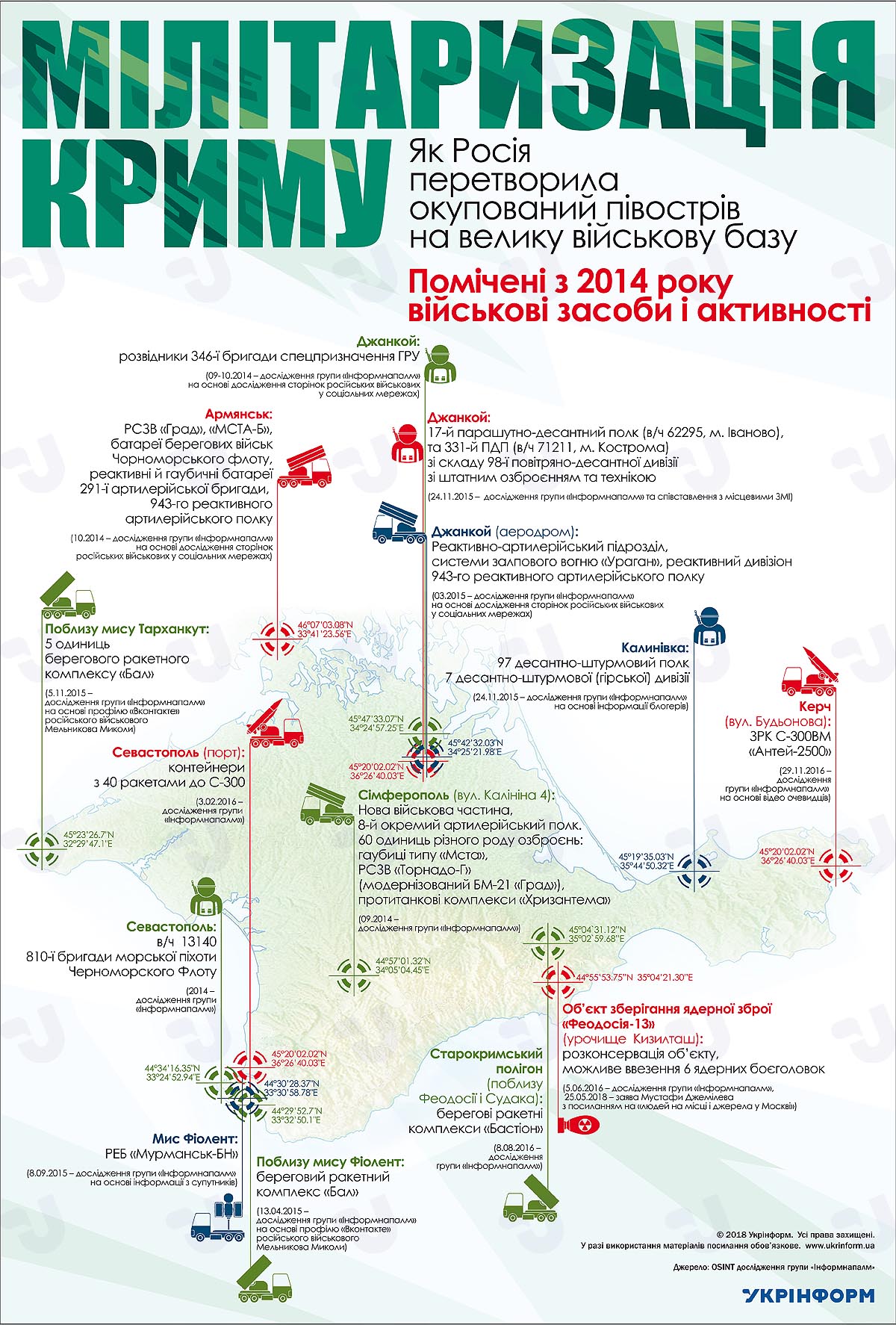 «За четыре года полуостров превратился в «непотопляемый авианосец», гигантскую военную базу. Количество «зеленых человечков» возросло почти до 32 тысяч, количество самолетов — до 122-х, военных кораблей — до 71-го, зенитно-ракетных комплексов — до 16-ти, количество подводных лодок — до семи», — говорится в сообщении.