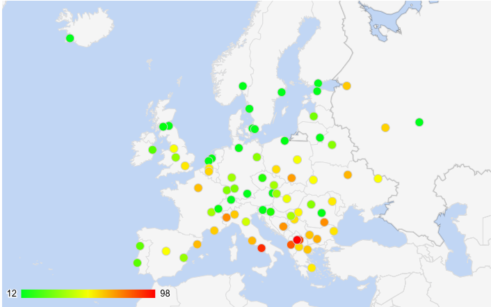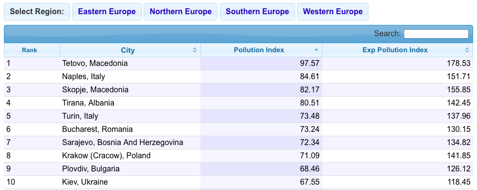 На первом месте в рейтинге самых загрязненных городов Европы — македонский Тетево. Второе и третье место заняли Неаполь (Италия) и Скопье (Македония). Также в десятку городов с неблагоприятной экологией попали города Албании, Италии, Румынии, Боснии и Герцеговины, Польши и Болгарии.