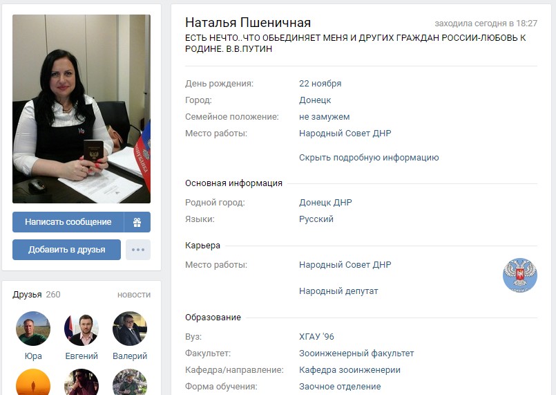 Наталья Пшеничная занимает свою должность в «ДНР» с 4 ноября 2014 года. Накануне «выборов» она занималась организационными мероприятиями и пиаром главаря «ДНР» Дениса Пушилина.