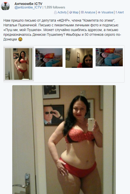 «Я вам ещё не рассказывал, что наши коллеги из Киберхунты настолько суровы, что могут залезть даже в штаны к сепаратистам? Или всё ещё думаете, что камеру на компьютере заклеивают параноики? Я хотел бы извиниться перед чувствительными особами за опубликованное изображение (я имею в виду флаг «ДНР»). Знакомьтесь, на фото небрежно возлежит депутат народного совета «республики» Наталья Пшеничная из комитета по этике. К выборам готовится. Где-то на фоне играет песенка «Push me and then just touch me». Стажировку в Воронежеской думе проходила, думаю после такого бедный город уже можно не бомбить», — написал хактивист Шон Таунсенд в Facebook.