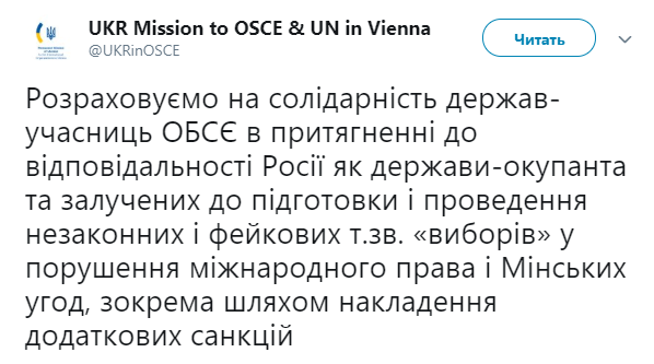 «Незаконные и нелегитимные так называемые «выборы» на оккупированном Россией Донбассе не признаны ни Украиной, ни международным сообществом. Их результаты не имеют никакой юридической силы», — отметил представитель Украины.