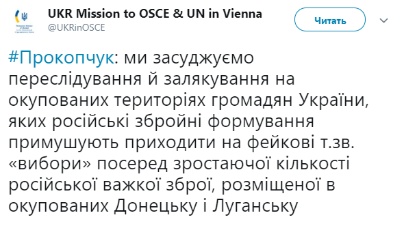 Постоянный представитель Украины при международных организациях в Вене Игорь Прокопчук на специальном заседании Постоянного совета ОБСЕ призвал привлечь Россию к ответственности за незаконные «выборы».