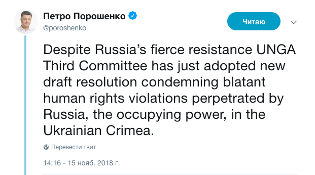 «Несмотря на яростное сопротивление России, Третий комитет ООН только что принял новый проект резолюции, осуждающий вопиющие нарушения прав человека, совершенные Россией, страной-оккупантом, в украинском Крыму», — отметил президент Украины Петр Порошенко.
