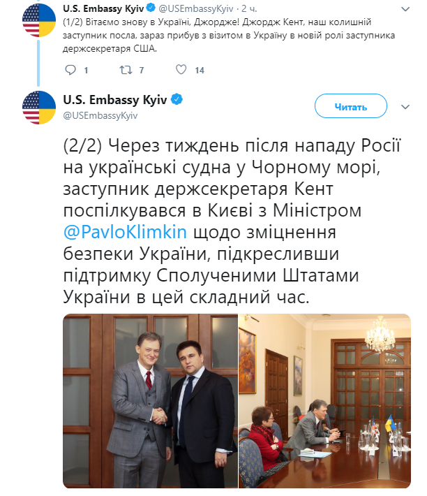 «Через неделю после нападения России на украинские суда в Черном море, заместитель госсекретаря Кент пообщался в Киеве с министром Павлом Климкиным относительно укрепления безопасности Украины, подчеркнув поддержку Соединенными Штатами Украины в это сложное время», — говорится в сообщении.