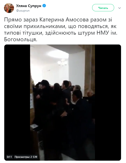 «Прямо сейчас Екатерина Амосова вместе со своими сторонниками, которые ведут себя, как обычные титушки, осуществляют штурм НМУ им. Богомольца», — написала Супрун.