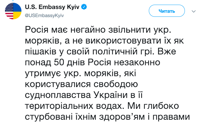 «Россия должна немедленно освободить украинских моряков, а не использовать их как пешек в своей политической игре. Уже более 50 дней Россия незаконно удерживает украинских моряков, которые пользовались свободой судоходства Украины в ее территориальных водах. Мы глубоко обеспокоены их здоровьем и правами», — говорится в сообщении.