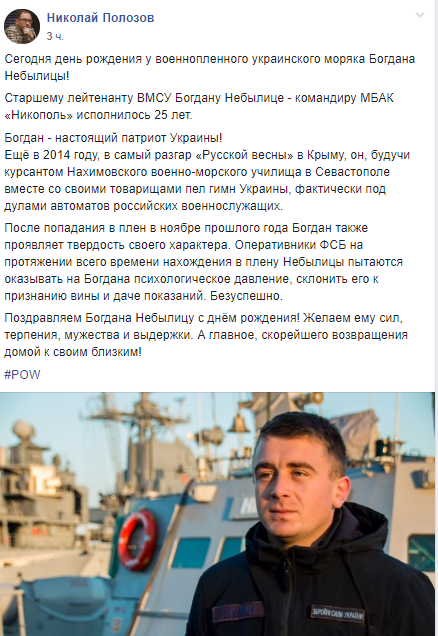 Поздравляем Богдана Небылицу с днём рождения! Желаем ему сил, терпения, мужества и выдержки. А главное, скорейшего возвращения домой к своим близким!» — написал Полозов.